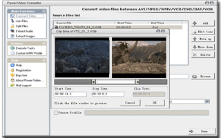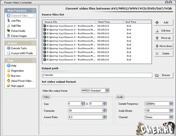 Утилита Power Video Converter предназначена для преобразования видеофайлов из одного формата в другой. Кроме этого, Power Video Converter позволяет производить резку и склейку файлов. Программа поддерживает форматы AVI, MPEG1, MPEG2, VCD, SVCD, DVD (PAL, NTSC), ASF и WMV. Среди особенностей программы - возможность пакетной обработки файлов, а также извлечение аудиотреков в форматы WAV, WMA и MP3.