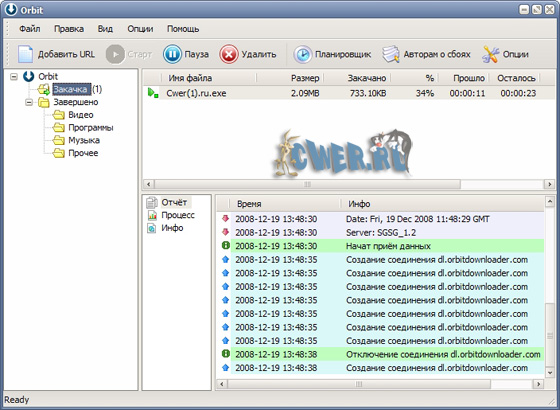 Orbit Downloader - менеджер закачек файлов из Интернета. Данная программа закачивает файлы в многопоточном режиме, поддерживает интеграцию с различными браузерами, может закачивать файлы, расположенные в файлообменных сервисах, в частности, с RapidShare.com. Программа не требовательна к ресурсам компьютера. Orbit Downloader позволяет скачивать файлы по многим протоколам (HTTP, HTTPS, FTP, RTSP и MMS), может просматривать содержимое ZIP-файла до его скачивания и автоматически загружать файлы по расписанию, а также имеет расширенные настройки для работы через прокси-сервер. Предусмотрена возможность сохранения на компьютере флеш-роликов и потоковых аудио/видео данных, встречающихся на веб-сайтах. Если Orbit Downloader распознает такой тип контента на веб-странице, то он автоматически выводит на нем специальную кнопку для скачивания. Интерфейс программы переведен на многие языки, в том числе и на русский.