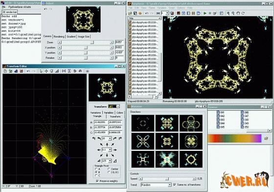 Ultra Fractal позволяет создавать фрактальные изображения любых объемов, форм и сложности. В одном окне документа можно накладывать друг на друга несколько слоев, добиваясь особой выразительности рисунка. Все фракталы просчитываются в режиме просмотра "на лету", есть возможность запускать финальный rendering в пакетном режиме. Незаменима для создания "сногсшибательных" орнаментов, постеров, бэкграундов и т. д.