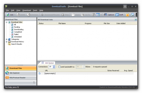 DownloadStudio – это простой и вто же время мощный в использовании менеджер с режимом быстрого запуска и мастером закачки. Расширенная помощь и руководства объяснят вам, как закачивать различные типы содержимого с веб сайта. Поддерживает все популярные Интернет протоколы - HTTP, HTTPS, FTP, MMS, RTSP, RSS, RDF и ATOM.