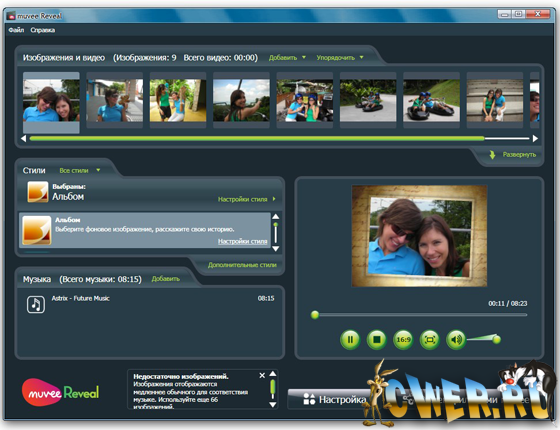 Muvee Reveal - полный автомат для создания фильмов в домашних условиях из фотографий и видео. Нужен тем, кто не привык "заморачиваться" тонкостями видеомонтажа. Всего в один клик вы переместите материал в конструктор с вашей видеокамеры, телефона, или фотокамеры, - любое кино независимо от его формата, включая высокой четкости разрешением 1280x720 и 1920x1080 и в видео форматах NTSC и PAL Можно добавить соответствующую музыку, закадровый текст и пр., а все остальное сделает программа сама.