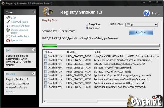 Простая в использовании и очень эффективная программа для очищения реестра. Программа точно определяет ключи, которые недействительны или не используется, используя метод по трем действиям для проверки каждого ключа, чтобы точно определить его действительность.