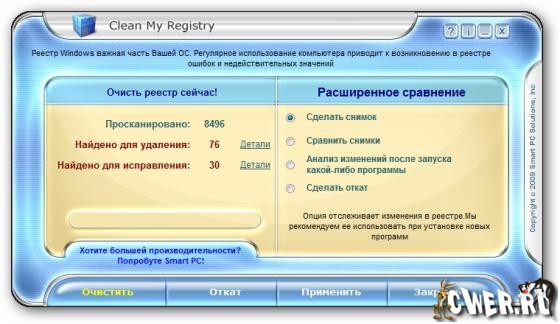 Clean My Registry предназначен для очистки реестра Вашего компьютера, а также для наблюдения за реестром. Вы можете сделать снимок реестра на определенную дату, отследить изменения, вносимые другими программами и многое другое!