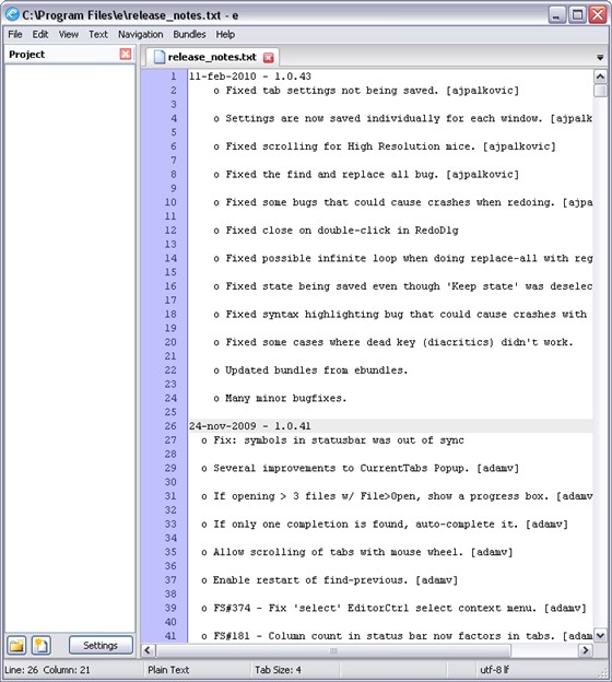 Е-TextEditor - это клон самого популярного в мире OSX редактора TextMate. Благодаря использованию cygwin он поддерживает большинство стандартных пакетов (bundles), написанных для оригинального TextMate. Разработчики стремились к максимальной совместимости как в комбинациях клавиш так и во внешнем виде.