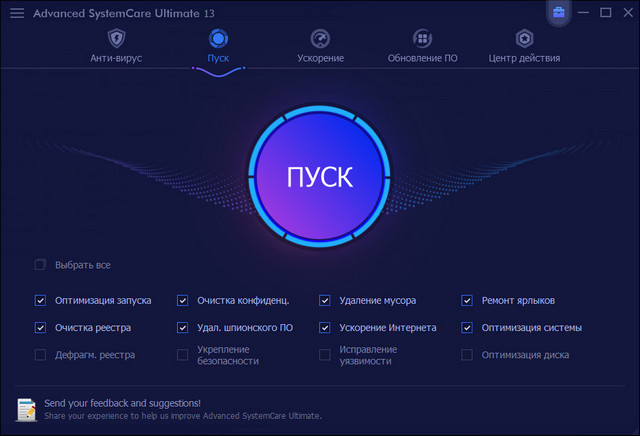 Advanced SystemCare - программный пакет, содержащий множество модулей для оптимизации, настройки и повышения производительности компьютеров, на базе ОС Windows 2000/XP/Vista/7/8/10. Приложение позволяет очистить компьютер от шпионского и рекламного ПО, найти и ликвидировать возможные угрозы и бреши в системе безопасности ОС, исправить ошибки в системном реестре, очистить временные и ненужные файлы, управлять списками автозагрузок, оптимизировать работу ПК.