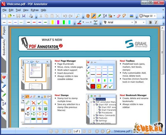 PDF Annotator позволяет пользователю открыть файл PDF и добавлять аннотации, с помощью мыши или электронной ручки Tablet PC, непосредственно на страницах PDF файла. Аннотированные документы могут быть сохранены непосредственно обратно в формат PDF. Таким образом, каждый может читать или распечатывать PDF-аннотированные документы.