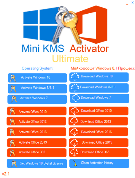 KMSOffline - активатор от Ratiborus, который может активировать Windows XP, Windows Vista, 7, Windows 8, 8.1, 10, Server 2008, 2008 R2, 2012, 2012 R2, 2016, 2019, Office 2010/2013/2016/2019.