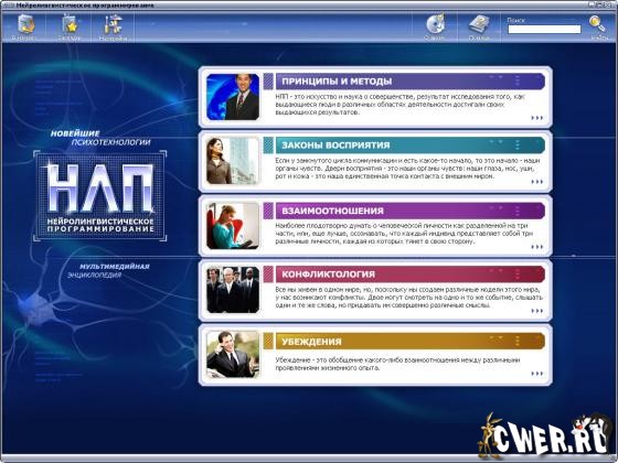 В пяти разделах энциклопедии НЛП: "Принципы и методы", "Законы восприятия", "Взаимоотношения", "Конфликтология", "Убеждения" – можно найти исчерпывающие сведения о методах НЛП, о том, как устроено наше мышление и как можно сделать наши цели реально достижимыми.