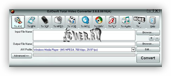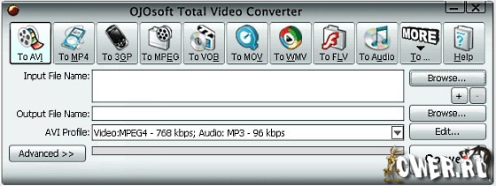 OJOsoft Total Video Converter - мощная программа, которая позволяет конвертировать любые видеофайлы в форматы 3gp (формат мобильных телефонов и наладонников), mp4, psp, iPod, swf, flv, DVD, VCD. Программа поддерживает чтение и проигрывание большого количества видео и аудио форматов (3gp, mp4, psp, iPod, swf, flv, DVD, VCD, mp3, ac3, ogg, wav, aac...), а также конвертирует их в популярные video/audio форматы и форматы мобильных телефонов и наладонников.
