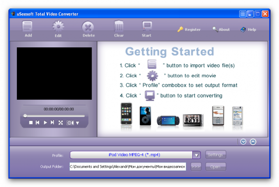 uSeesoft Total Video Converter —неплохой конвертер видео-файлов.С легкостью конвертирует почти все видео форматы AVI, MP4, MPEG, MKV, MPG, WMV, TS, FLV, MOV, h.264, DVR-MS, x.264, vc-1 и многие др., Поддерживает извлечение аудио из видео и преобразует в MP3, WMA, AC3, M4A, AAC и др