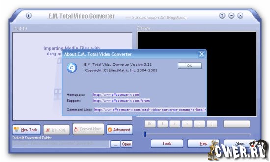 E.M. Total Video Converter HD- это как раз именно тот конвертер, который умеет делать с файлами почти всё. E.M. Total Video Converter это программа не только для конвертирования почти всех видов видео и музыкальных файлов в популярные форматы, включая мобильные, но и CD-риппинг, конструктор фото слайд-шоу с 300-ми различными фантазийными переходными эффектами, сборка и прожиг дисков отвечающих DVD/SVCD/VCD стандартам, извлечение звука из видео файлов с прямой конвертацией в mp3, ac3, ogg, wav, aac, объединение звука и видео в единый файл с синхронизацией, снифер-загрузчик флэш-видео Flv, и многое другое, снабженное собственным высокоскоростным встроенным "движком" и наделенное качественным проигрывателем.