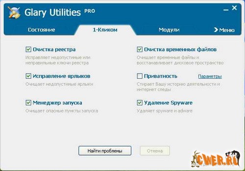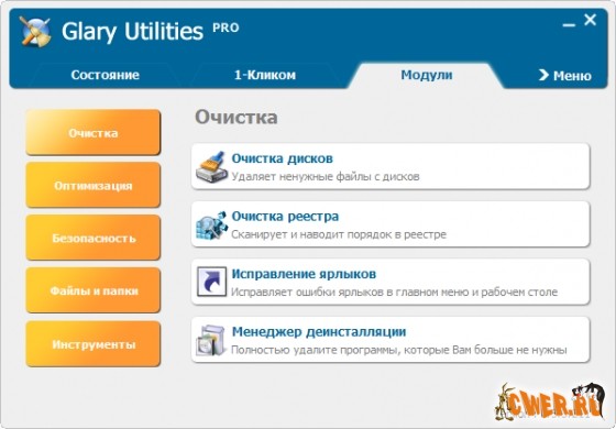 Функциональный набор системных твикеров и утилит для тонкой настройки, повышения общего уровня производительности и защиты ПК. Данное приложение позволяет пользователю избавиться от ненужных файлов, от устаревших регистрационных записей и истории Интернет-активности. При помощи Glary Utilities пользователь также может управлять (в том числе и удалять) различными модулями, используемыми для расширения функциональных возможностей браузера, производить анализ эффективности использования дискового пространства и поиск существующих копий определенных файлов.