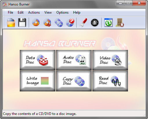 Hanso Burner - программа для записи CD / DVD с расширенными возможностями. Hanso Burner это простота и удобство записи - нет переполненных вкладок, лишних окон, значков или других бесполезных функций, которые могут вас запутать. В главном окне программы представлено 6 значков с основными функциями программы, а так же панель инструментов, которую можно настроить по своему усмотрению.