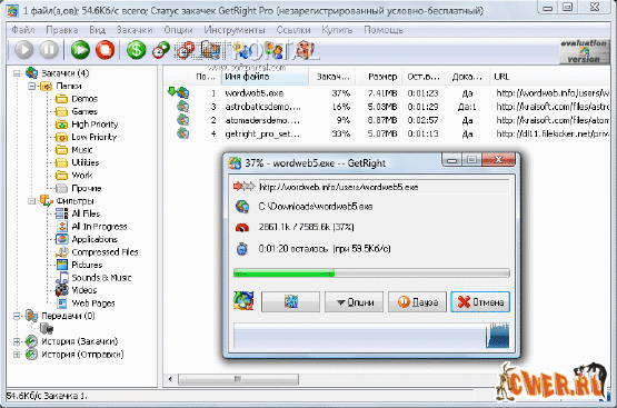 GetRight PRO популярный менеджер закачки. Наряду с возможностью разбивать файл на части, самостоятельно звонить в Интернет через dial-up модем, разрывать соединение, вести историю загрузок и планировать закачки.