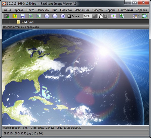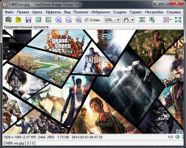 FastStone Image Viewer - вьювер, редактор и конвертер графических файлов. Поддерживает все популярные форматы графики, включая JPEG, JPEG 2000, GIF, PNG, PCX, TIFF, WMF, BMP, ICO, RAW и TGA. Обладает простым и удобными интерфейсом, сочетая его с большим количеством полезных возможностей. Поддерживается пакетное изменение размеров и переименование картинок, удаление ненужных фрагментов, подгонка и изменение цветов, установка водяных знаков и т.д. и т.п. Имеется возможность создавать слайдшоу с более чем 150 эффектами перехода и фоновой музыкой, присутствует различные графические эффекты, ZOOM, полноэкранный режим, поддержка работы со сканером и т.д. Кроме всего этого, программа умеет делать скриншоты экрана, причем как экрана целиком, так и любой его части.