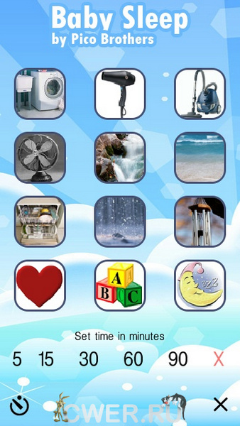 Baby Sleep Calls - программа которая включает в себя 12 различных звуков вызывающих сон и удобный таймер для автоматического выключения. В программе присутствуют такие звуки как фен, пылесос, стиральная машина, дорожный укладчик, река, океанские волны...