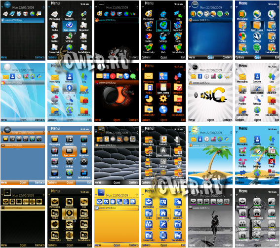 Темы для смартфонов Nokia под управлением Symbian OS 9.х: Nokia 3250, 5500 Sport, 5700, 6110 Navigator, 6120 c, 6121, 6220 classic, 6290, E50, E51, E60, E61, E61i, E62, E65, E70, E90, N71, N73, N75, N76, N77, N78, N79, N80, N81, N81 8GB, N82, N91, N92, N93, N93i, N95, N95 8GB и др. cwer.ws