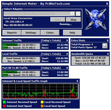 Новый монитор пропускной способности локальной и интернет сети, с мониторингом диапазона портов используемых конкретными программами, с выводом детальной статистики о каждом конкретном перемещаемом файле и извещением о приближении наступающего лимита. Имеет аскетичный интерфейс для создания минимальной нагрузки на систему и множество настроек, включая сквозное прозрачное проникновение через окна монитора, абсолютно не мешающие текущей работе на Рабочем Столе и многое другое.