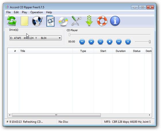 Accord CD Ripper - CD риппер, работающий с несколькими аудио форматами. Преобразовывает треки в wav и mp3 на довольно высокой скорости, которая еще увеличивается в многопроцессорных системах. Программа может искать информацию об альбомах как в локальных, так и в удаленных базах CDDB, эта информация затем может быть отредактирована. Запись мета-данных производится автоматически, есть встроенный CD плеер и многое, многое другое. Интерфейс программы предельно прост и дружественен.