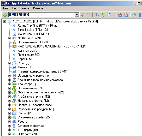 SoftPerfect Network Scanner - программа представляет собой многопоточный IP, SNMP (простой протокол сетевого администрирования, широко используемый в настоящее время, входит в стек протоколов TCP/IP) и NetBIOS (стандартный сетевой интерфейс, предложенный для IBM PC и совместимых систем) сканер. Данная программа передает специальные сигналы на компьютеры, сканирует их на предмет прослушивания портов TCP (протокол управления передачей) и показывает, какие виды и ресурсы используются в сети совместно.