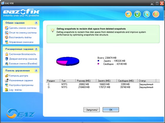 EAZ-FIX Professional предназначена для обеспечения безопасности компьютера, позволяет делать быстрые снимки операционной системы, а затем при необходимости восстанавливать систему из этих снимков. По заявлению разработчиков, EAZ-FIX может делать снимок системы всего за 5 секунд, а для того чтобы вернуть систему к первоначальному состоянию программе достаточно 10 секунд. Причём, снимок содержит все настройки операционной системы, инсталлированные программы и пользовательские данные. Можно сделать несколько снимков системы, а потом вернуться к любому состоянию из этих снимков. Восстановить операционную систему можно даже в том случае, если повреждён загрузчик или системные файлы.
