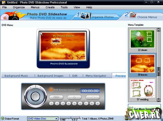 Photo DVD Maker Pro - является мощным и удобным в работе приложением для создания ошеломляющих слайд-шоу. Являетесь ли вы экспертом или новичком, это не имеет значения, программа проста и удобна в обращении. Особенности: создание непрерывного слайдшоу из фотографий или видео роликов неограниченного количества, наложение и соединение со звуковыми файлами (фоновая музыка), текстами, создание титров и субтитров, наложение эффектов перехода с выбором из более 360 эффекта перехода, создание проекта и прожиг в DVD, VCD или SVCD форматах для последующего просмотра на любом домашнем проигрывателе, iPod, Sony PSP, или сотовом телефоне.