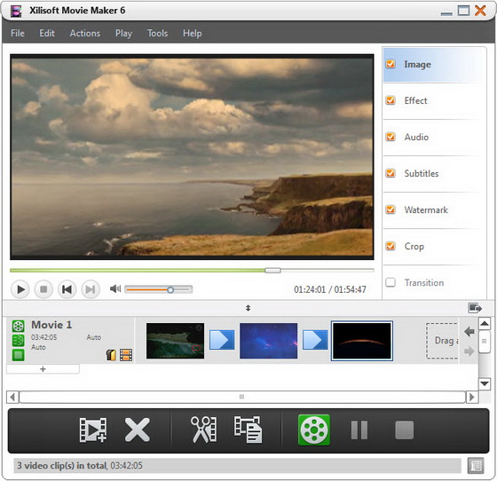 Xilisoft Movie Maker является мощным и простым в использовании инструментом, для редактирования и создания видео фильмов. Поддерживаются почти все видео форматы в том числе и форматы видеокамер (МТС, M2TS), HD видео (HD AVI, MPEG HD-2 / 4, HD VOB, WMV HD), а также самые популярные форматы видео (AVI, 3GP, M4V, MPEG, MP4, RM, RMVB, FLV, DV, VOB, SWF, MPV, MOV, QT, H.261/H.264, DAT, ASF, WMV). С помощью функции редактирования фильма, вы можете добавить субтитры и водяные знаки, использовать переходы, изменить видео-изображения, а также наложить музыку и обрезать видео.