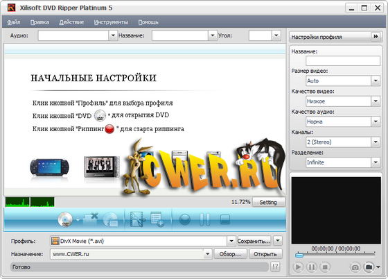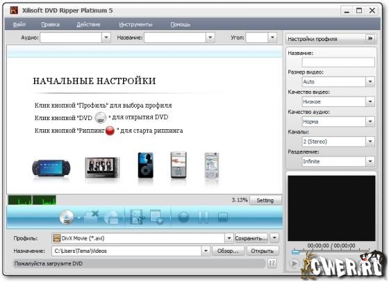Xilisoft DVD Ripper Platinum - программа для создания резервных копий DVD-дисков. Xilisoft DVD Ripper Platinum поддерживает риппинг во все самые популярные форматы, среди которых VI, MPEG, WMV, DivX, 3GP, MOV, MP4, MP3, WAV, AAC, M4A. Программа позволяет выбрать язык субтитров, разбить файл на куски указанного размера, задействовать звук Dolby Surround, выбрать битрейт аудио. Кроме этого, программа анализирует тип процессора и в зависимости от этого выбирает наилучшую скорость риппинга. Xilisoft DVD Ripper Platinum полностью задействует возможности последних процессоров и позволяет выполнять пакетное преобразование файлов.