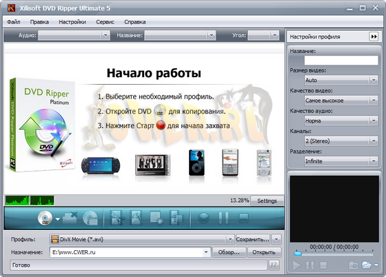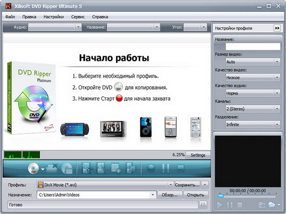 Xilisoft DVD Ripper Ultimate - мощная и удобная в использовании программа для копирования DVD-дисков с возможность конвертирования содержимого в соответствующие аудио и видео файлы типа AVI, MPEG, WMV, DivX, MP4, H.264, RM, MOV, M4V, XviD, 3GP, MP3, WMA, WAV, RA, M4A, AAC, AC3, OGG и т.д. Утилита способна создавать файлы, совместимые с iPod, iPhone, PSP, Apple TV и прочими портативными устройствами. Имеются опции конвертирования сегментов клипа, изменения размеров, наложения эффектов, добавления логотипов, предпросмотра результатов. Присутствует пакетная обработка файлов, получение информации из Интернет-баз и многие другие возможности.