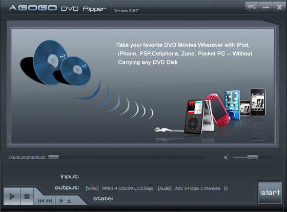 Agogo DVD Ripper это удобная программа, которая позволит вам сконвертировать любимый DVD диск в один из следующих форматов: DivX, XviD, AVI, iPod, PSP, 3GP, Pocket PC, VCD, SVCD. Программа очень проста в использовании – всего пару щелчков мыши, вы выбираете субтитры, аудио-дорожки и редактируете качество аудио и видео.