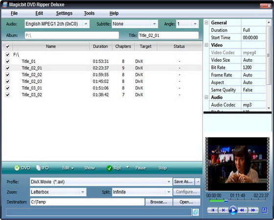 Magicbit DVD Ripper Deluxe - мощная утилита для копирования и рипа DVD. С ее помощью вы можете рипать DVD в любой видео- и аудио-формат напрямую! Поддерживаются выходные форматы: Direct to iPod, iPhone, PSP, mobile phones, PDA phone, AppleTV and AVI, MPEG, WMV, DivX, RM, MOV, MP4, 3GP, 3G2, Xvid, ASF, FLV и т.д.