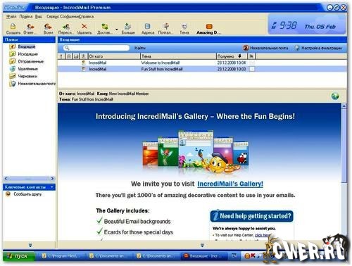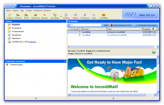 IncrediMail: Очень оригинальная почтовая программа, причем главная ее особенность - не набор функций по обработке корреспонденции, а совершенно новые, не имеющиеся ни в одной из других почтовых программ, возможности по оформлению писем с помощью анимации, создания "прыгающего" текста, включения в текст графических смайликов и многого другого, включая самые разнообразные 3D-эффекты.
