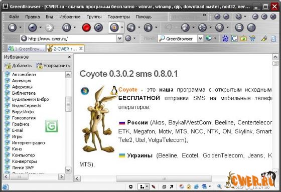 Многовкладочный браузер на движке Internet Explorer с расширенными возможностями: URL-псевдонимы, URL-клавиши (горячие клавиши для открытия заранее определенных сайтов), жесты мыши, быстрая очистка кеша и куков, встроенный менеджер загрузок, кнопка быстрого выбора прокси, Сборщик разных объектов (текста, рисунков, скриптов) и многое другое. Обратите внимание: изображение зеленой буквы "G" в квадратике, появляющееся при запуске браузера, это не просто картинка, а многофункциональная кнопка, которую можно перетаскивать в любую часть экрана (в том числе, когда сам браузер минимизирован в трей).