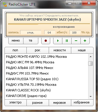 RadioClicker Lite - программа для приёма трансляций онлайн-радио. Кроме приёма радиостанций, RadioClicker позволяет настраиваться на просмотр различных телеканалов, осуществляющих вещание через интернет.