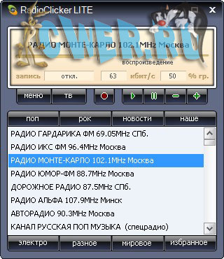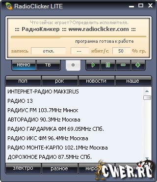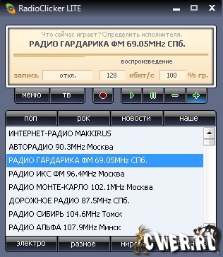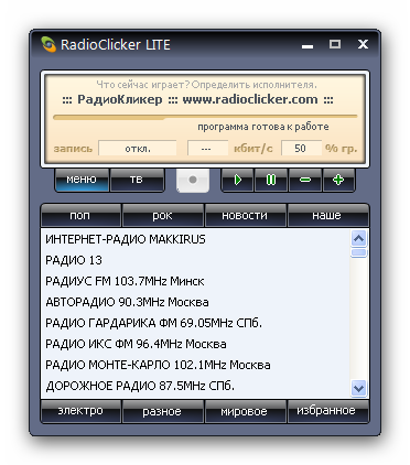 RadioClicker - Программа для прослушивания радиостанций и просмотра ТВ через интернет.В программе собраны практически все online-станции радио и ТВ вещающие на русском языке через сеть интернет.