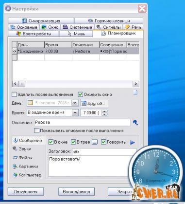 Программа показывает и говорит время, длительность работы Windows (показания записываются в журнал) и синхронизирует время с сервером в Интернет. Есть возможность заменять стандартные часы в трее, изменять их внешний вид и отображаемый текст. Имеется планировщик и множество настроек.