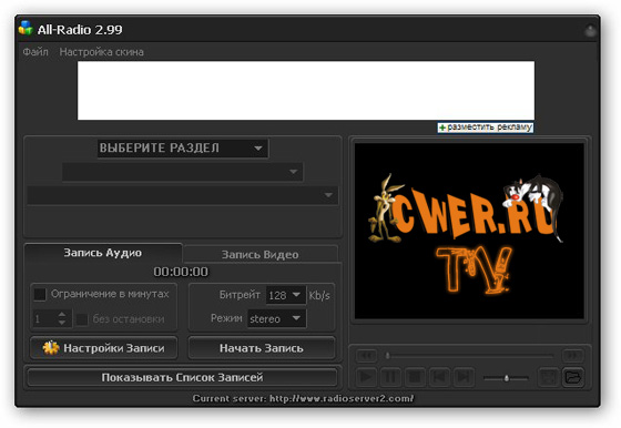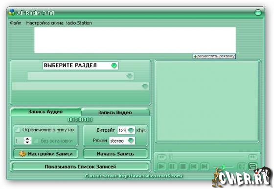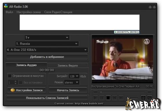 All-Radio - Программа для прослушивания радиостанций и просмотра ТВ-каналов, вещающих через интернет с возможностью записи аудио и видео потока. На сегодняшний день в программе собрано: радиостанций – 2498, ТВ-станций – 1121, видео – 135. При этом список их еженедельно обновляется (для пользователя обновление происходит автоматически при запуске программы). Все станции сгруппированы по странам, что делает их поиск наиболее удобным. В программе собраны практически все РАДИО и ТВ станции, вещающие на русском языке.