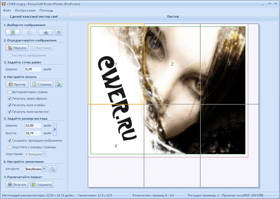 Программа для создания из картинки/фотографии постеров разного размера. Для печати не нужен специальный плотер, теперь печатать постеры можно на обычном принтере!