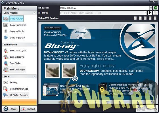 DVD neXt Copy - программа для копирования DVD. Программа позволяет делать резервные копии DVD фильмов. Предпросмотр треков перед и во время копирования, поддержка однослойных и двухслойных дисков, мультиканального звука (Dolby digital 5.1, dts), поддержка NTSC и PAL DVD фильмов, делают эту программу одной из лучших в своём классе.