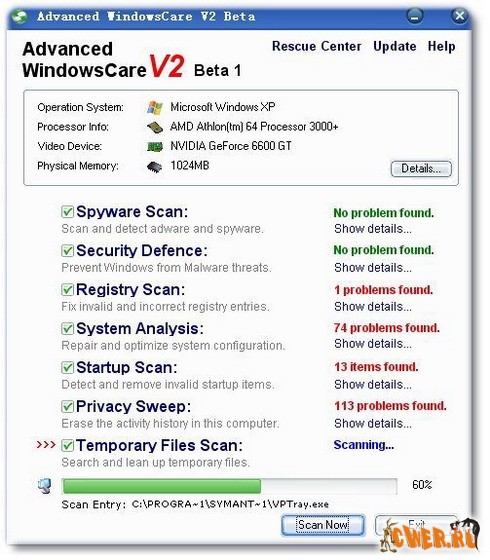 Программа для оптимизации системы, работающая по принципу "все-в-одном-за-один-клик". Advanced WindowsCare проводит анализ системы, после чего производит оптимизацию системной конфигурации, в том числе изменяет на оптимальные настройки безопасности, удаляет из системы Spyware и Adware, исправляет ошибки в системном реестре, удаляет временные файлы, оптимизирует параметры интернет-соединения, позволяет управлять автозагружаемыми приложениями и т.д. и т.п.