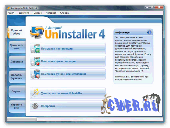 Ashampoo UnInstaller отслеживает и регистрирует изменения, которые вносят инсталляционные программы, что позволяет при необходимости корректно - то есть полностью - удалить ненужную программу. Положительным качеством является то, что UnInstaller удаляет не только те приложения, что были установленны с ее помощю, но и путем анализа деинсталлирует программы, мониторинг которых не производился. Кроме своей основной функции программа может: искать и удалять пустые папки; одинаковые и временные файлы; просматривать список всех установленных в системе шрифтов и удалять ненужные; удалять временные файлы Интернета, 'кэшированный' контент, файлы cookies, адреса сайтов введенные в ручную.