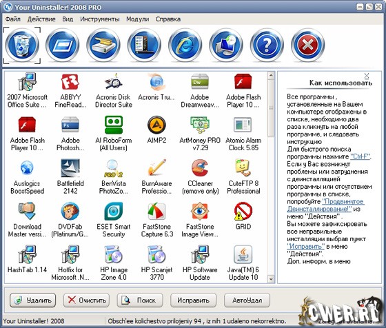 Your Uninstaller! - Обеспечивает решение задач по деинсталляции приложений, установленных на вашем компьютере. Он служит заменой стандартному диалогу Добавить/Удалить программу Windows. При этом работает приблизительно в 5-10 раз быстрее. Может показывать соответствующие значки приложений. Имеется функция поиска приложения по ключевому слову. Your Uninstaller! автоматически обнаруживает неисправные ключи реестра и полностью удаляет их по вашему разрешению. Возможно ручное удаление записей об установленных программах из системного реестра.