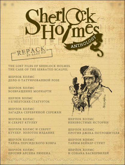 Издание «Шерлок Холмс. Антология» собрало в себе превосходную коллекцию из семнадцати квестовых игр об одном из самых прославленных сыщиков XIX века - Шерлоке Холмсе и его верном друге докторе Ватсоне. Сайт Cwer.ws предлагает вам скачать полную антологию игр о Шерлоке Холмсе, чтобы вместе с их главными героями пережить множество увлекательных и опасных приключений.