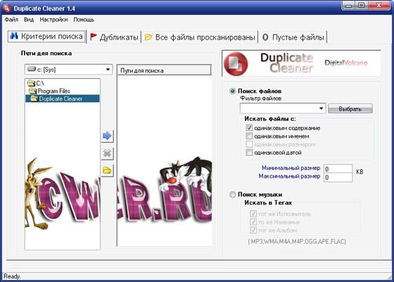 Duplicate Files Cleaner - мощная и профессиональный инструмент для 100% -го, "Бит-В-Бит" поиска и удаления одинаковых файлов с компьютера которые напрасно занимают место, тормозят работу жесткого диска и как следствие, снижают скорость работы самого компьютера. Duplicate File Cleaner - быстро находит и удаляет одинаковые файлы (дубликаты) независимо от их типа, - фотографии, музыку, видео или письма Outlook.