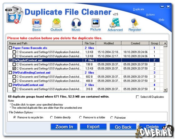 Duplicate Files Cleaner - мощная и профессиональный инструмент для 100% -го, "Бит-В-Бит" поиска и удаления одинаковых файлов с компьютера которые напрасно занимают место, тормозят работу жесткого диска и как следствие, снижают скорость работы самого компьютера. Duplicate File Cleaner - быстро находит и удаляет одинаковые файлы (дубликаты) независимо от их типа, - фотографии, музыку, видео или письма Outlook.