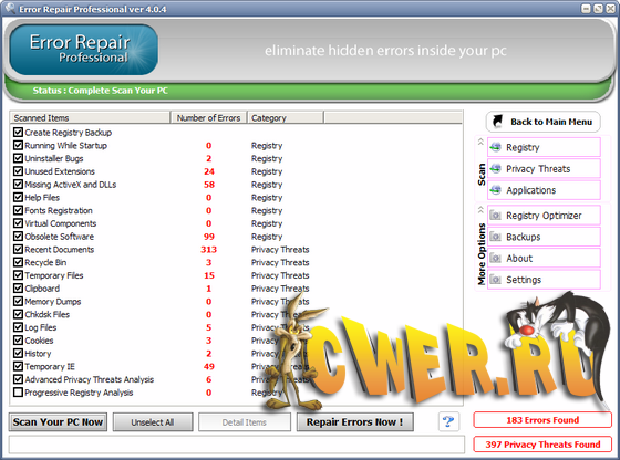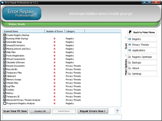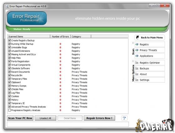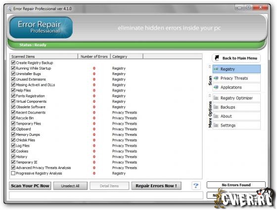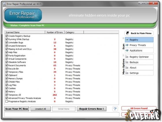 Error Repair Professional - cлужит для того, чтобы содержать Ваш PC в оптимально работающем состоянии. Error Repair Pro очистит и восстановит ошибки в Вашем PC единственным щелчком мыши. Всего несколько несколькими легких шагами, Вы сможете просмотреть весь реестр. Удалит, и исправит ошибки для любых неправильных записей и обеспечит вывод списка найденных ошибок. Так же Вы можете выборочно (вручную) исправлять любую ошибку или автоматически восстанавливать после сбоя в работе.