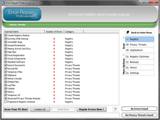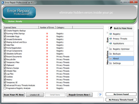 Error Repair Professional - это небольшая утилита для исправления ошибок в настройках операционной системы. Программа обладает высокой скоростью работы и за считанные секунды проверит ваш компьютер на наличие ошибочных записей и сама исправит их. Для продвинутых пользователей присутствует ручной режим работы. Найдет неполадки в реестре, библиотеках данных системы и приложений, а также серьезные ошибки, допущенные пользователем, ставящие безопасность системы под угрозу.