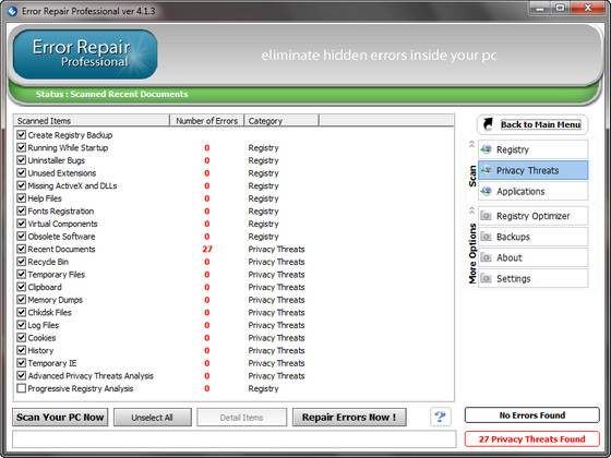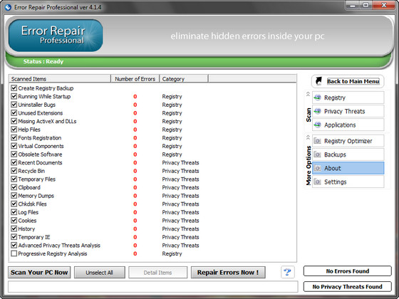 Error Repair Professional - это небольшая утилита для исправления ошибок в настройках операционной системы. Программа обладает высокой скоростью работы и за считанные секунды проверит ваш компьютер на наличие ошибочных записей и сама исправит их. Для продвинутых пользователей присутствует ручной режим работы. Программа может найти неполадки в реестре, библиотеках данных системы и приложений, а также серьезные ошибки, допущенные пользователем, ставящие безопасность системы под угрозу.