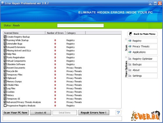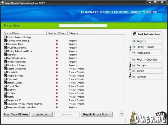 Error Repair Professional - служит для того, чтобы содержать Ваш PC в оптимально работающем состоянии. Очистит и восстановит ошибки в Вашем PC единственным щелчком мыши.
