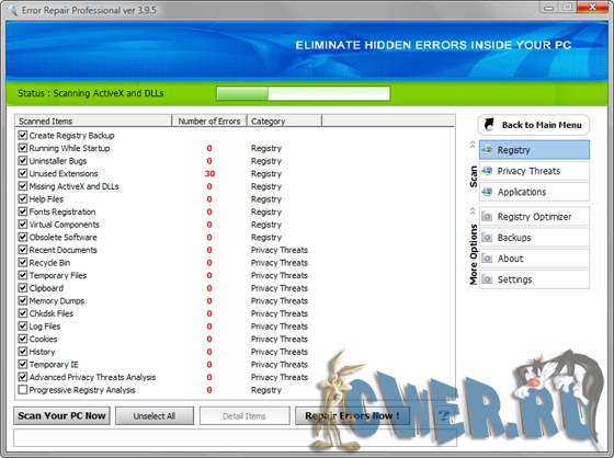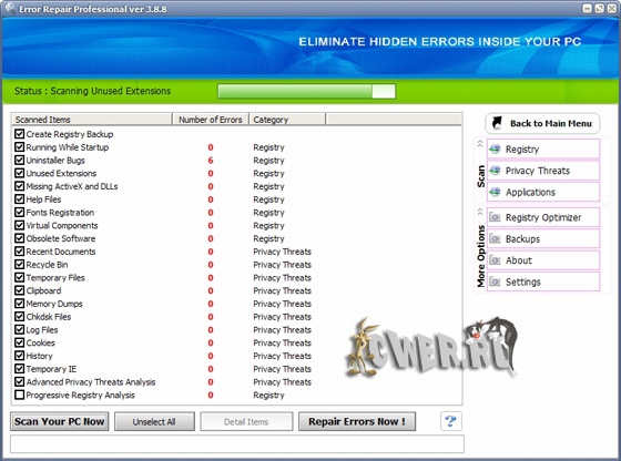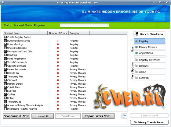 Error Repair Professional - программа найдет неполадки в реестре, библиотеках данных системы и приложений, а также серьезные ошибки, допущенные пользователем, ставящие безопасность системы под угрозу. Ошибки в операционной системе могут привести ко многим неприятностям. Избежать их можно только одним способом — вовремя обнаружить и исправить. И то и другое поможет сделать данная программа.